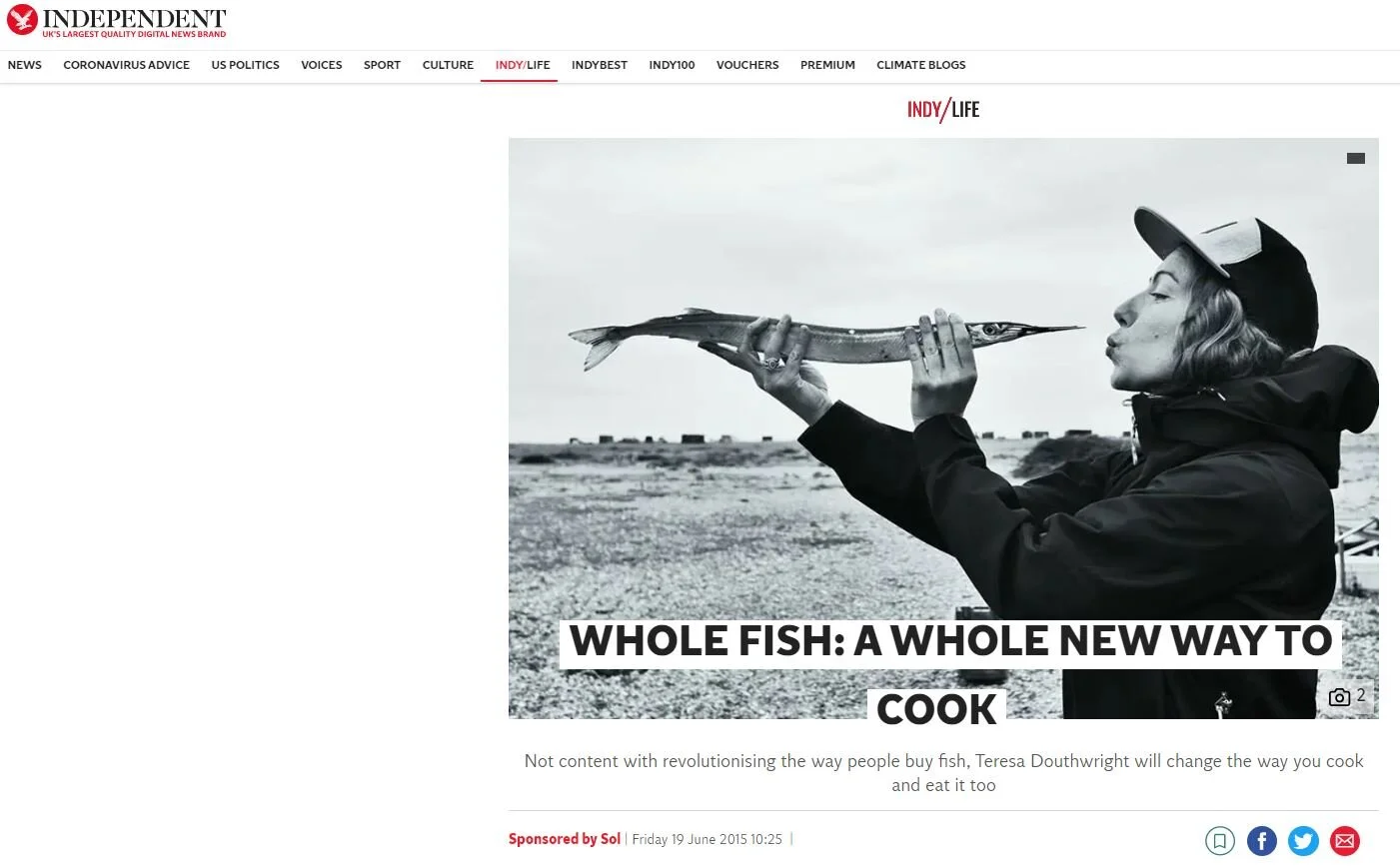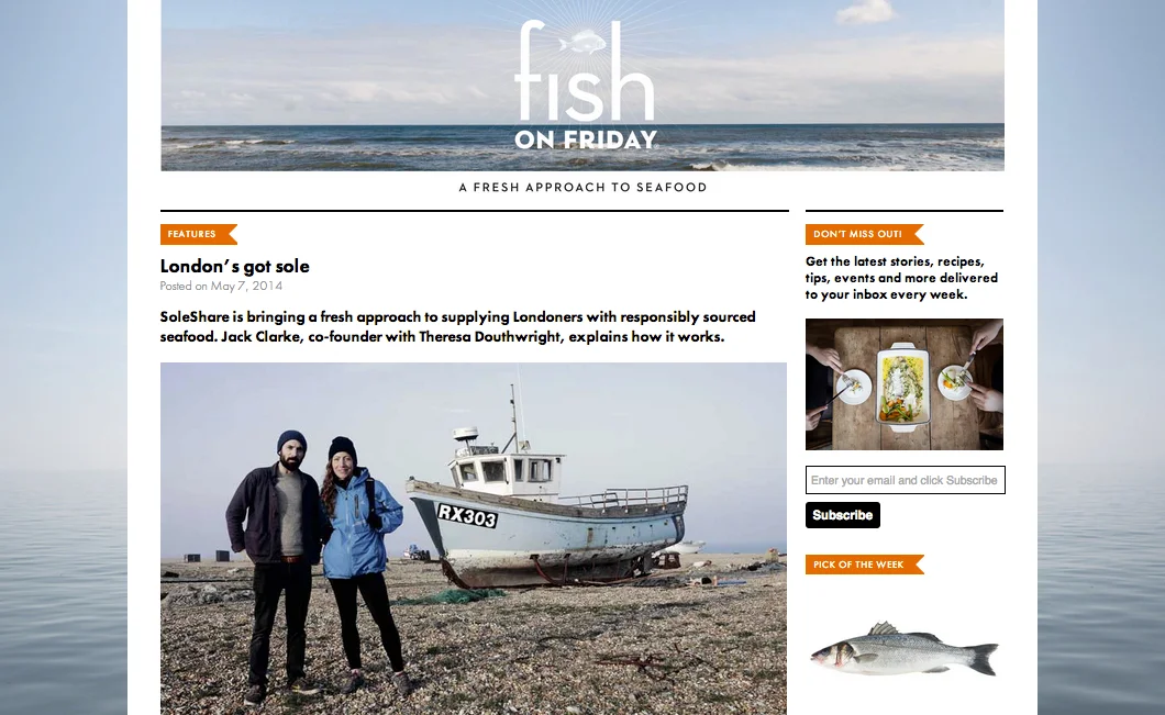 Press Written in collaboration with Moshi Moshi and Sole of Discretion, as part of our sustainable seafood event. Read here Pinney of Orford Read here Mick the fish Read here London Evening Standard. June 2015 The Independent. June 2015. Coast Magazine. May 2015. Al Jazeera. Dec 2014. Sustainable Seafood. Sustainable Food Trust. Sept 2014. The New Faces of London Food. Fish on Friday. May 2014. The Telegraph. Word of Mouth. March 1st, 2014. Introducing SoleShare BBC Radio 4 - You and Yours. Oct 2013. Sustainable fish and SoleShare (fwd to 13:50) Flavour First. November 2013 The Grocer. Sept 2013